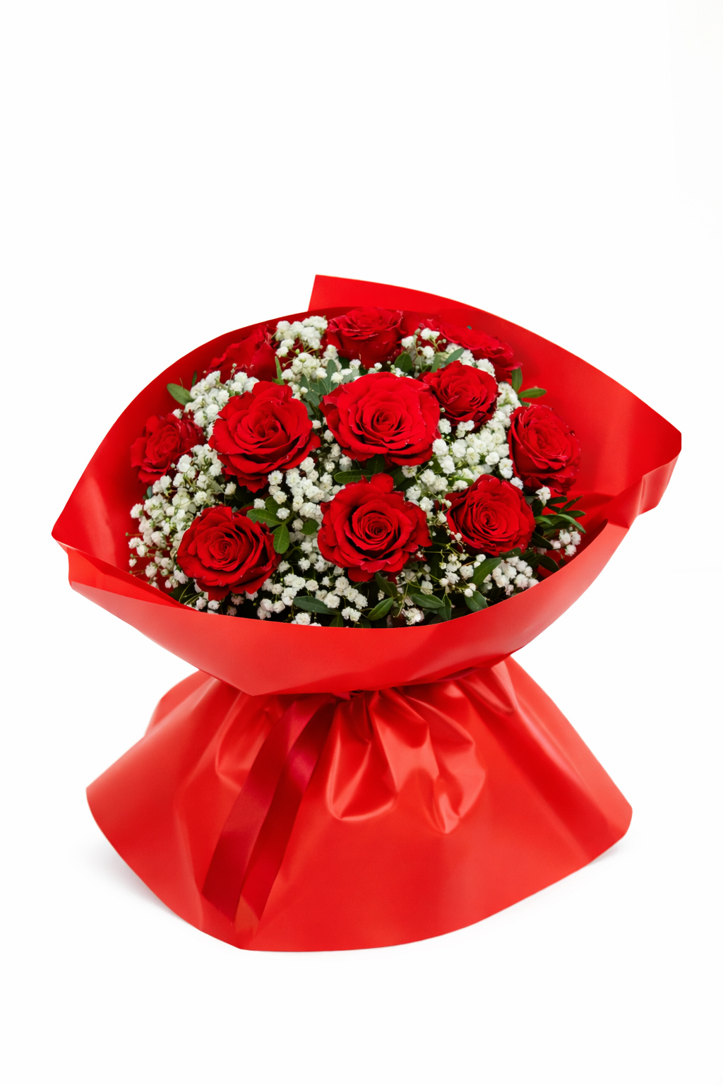 Κόκκινα τριαντάφυλλα εισαγωγής ,με φυλλώματα ,γυψοφίλη και πολυτελές κόκκινο περιτύλιγμα