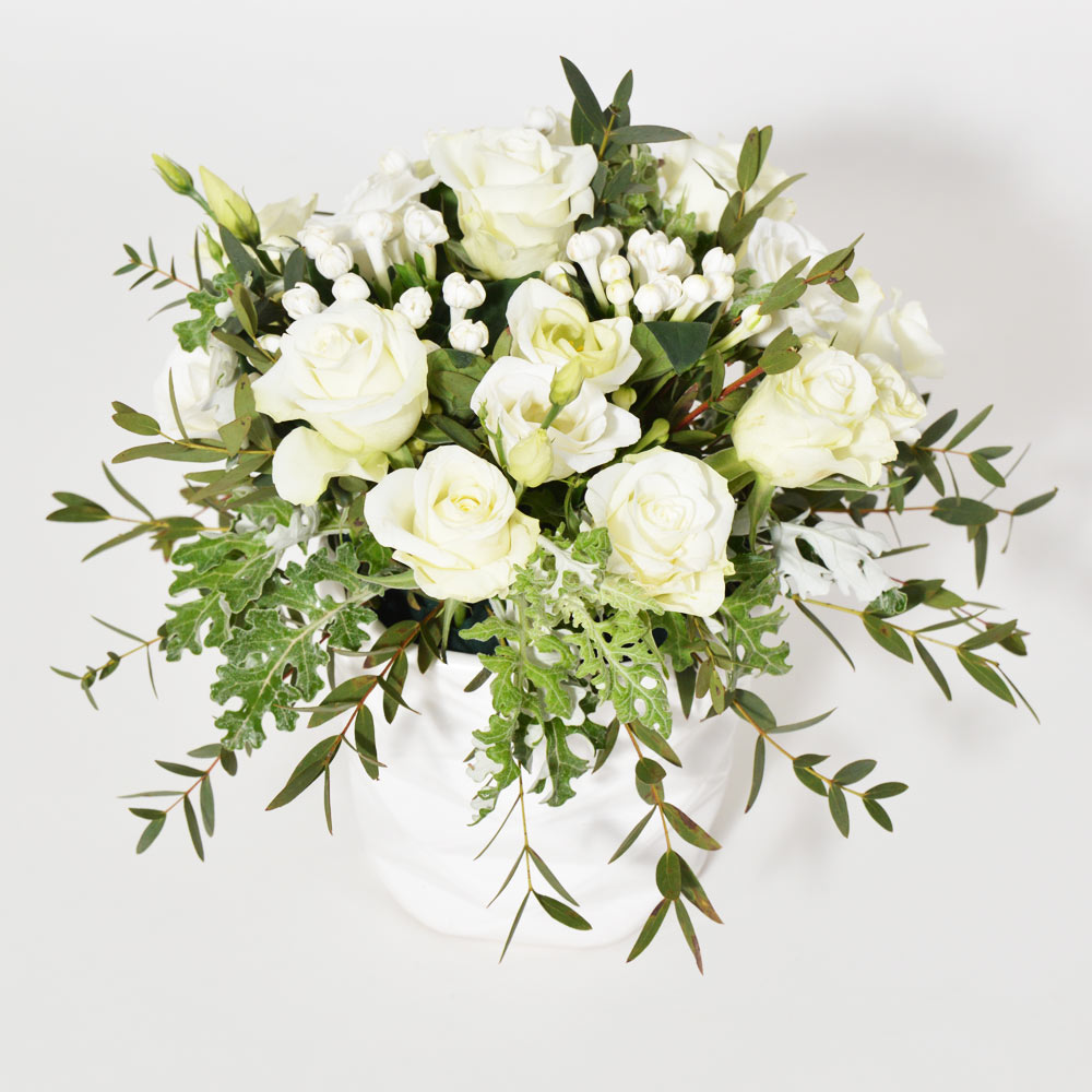Σύνθεση σε λευκό κεραμικό κασπω με λευκά τριαντάφυλλα, λευκό λυσίανθο, λευκή βουβάρδια και πρασινάδα.