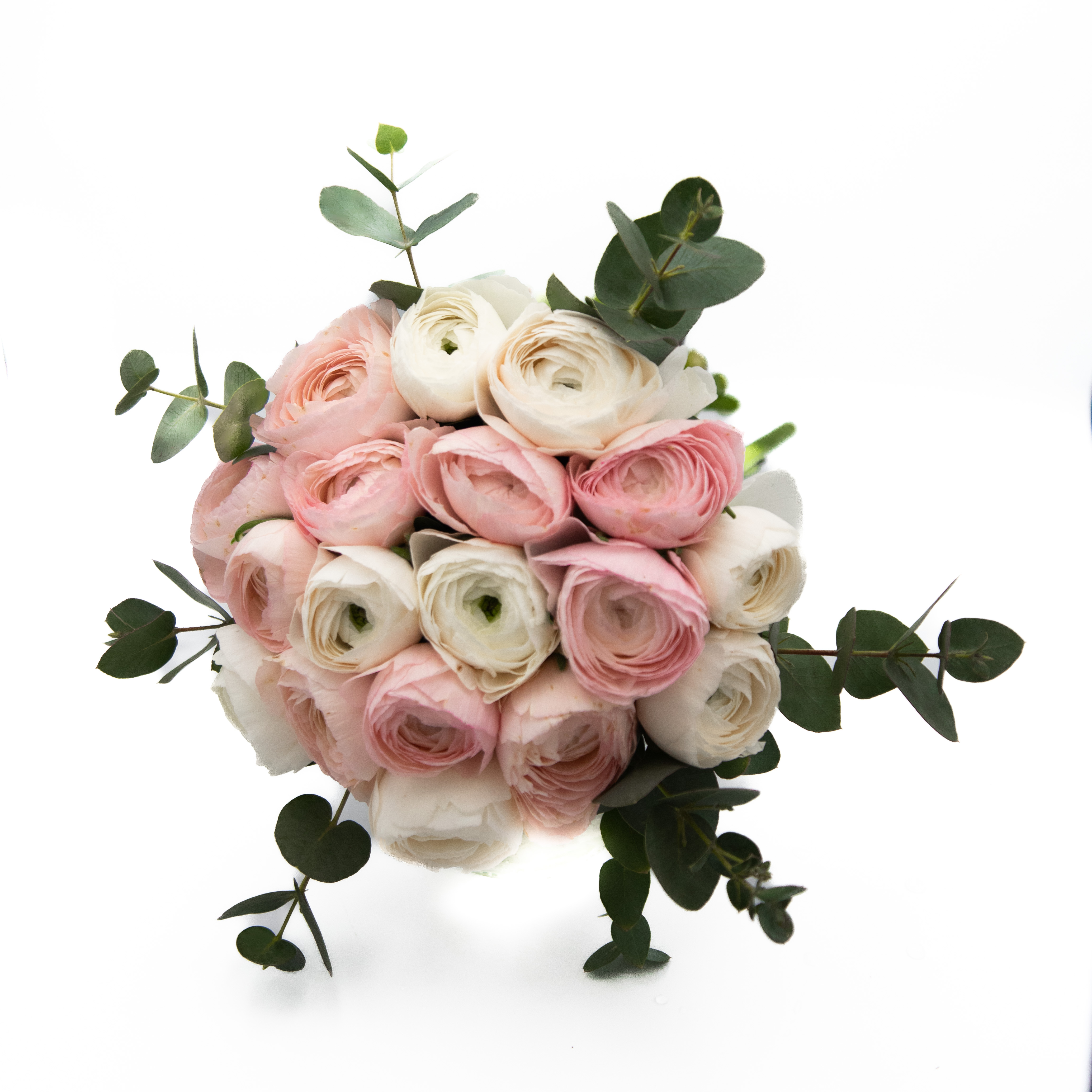 Ένα κομψό και ρομαντικό μπουκέτο με φίνα ροζ και λευκά ranunculus, δεμένα αρμονικά με φυσικό ευκάλυπτο.