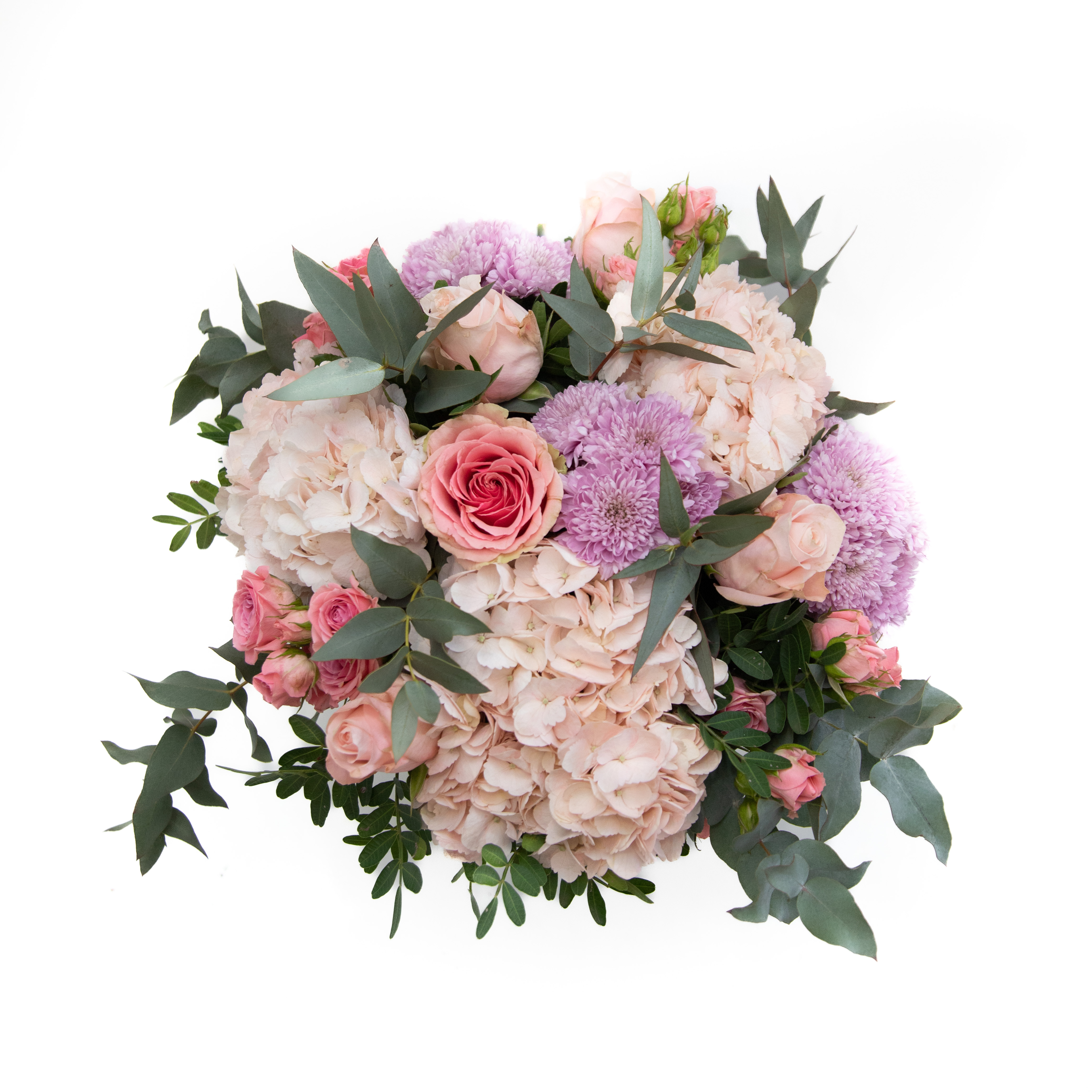 Μπουκέτο υψηλής αισθητικής από ροζ ορτανσίες, ροζ και σομόν τριαντάφυλλα, λιλά χρυσάνθεμα και ευκάλυπτο,