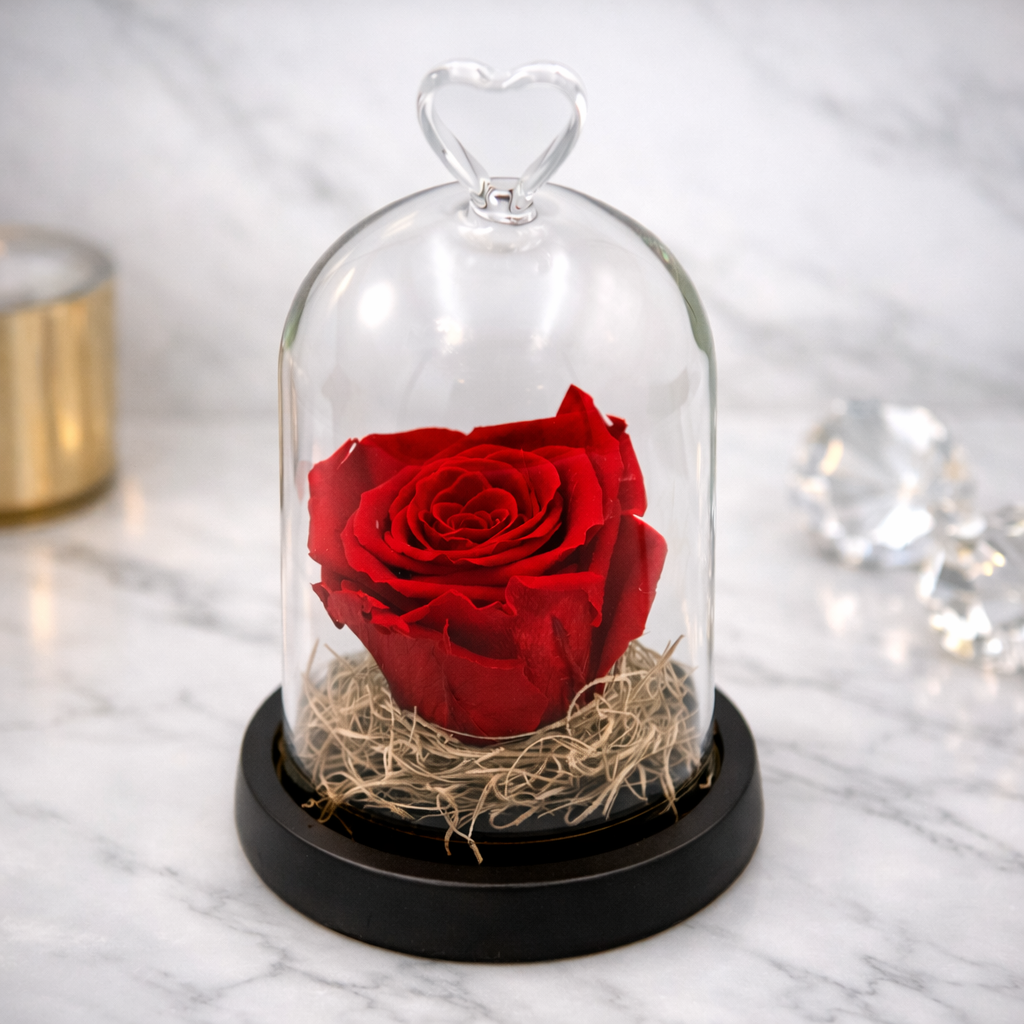 .;Ένα εντυπωσιακό Forever Rose σε έντονο κόκκινο χρώμα προστατευμένο σε γυάλινη πολυτελή συσκευασία.
