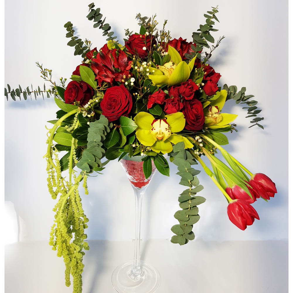 Σύνθεση λουλουδιών σε γυάλινο ποτήρι μαρτίνι 60 cm. Τριαντάφυλλα , τουλίπες, ορχιδέες, Αλστρομέρια, ευκάλυπτο και αμάρανθο